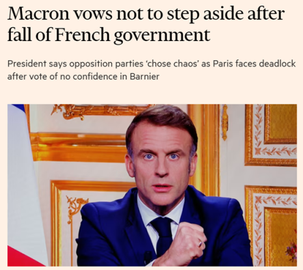 4日晚,法国左翼党团提议的不信任动议以331票的全王人大批在法国国民议会得到通过,宣告了巴尼耶政府的打消。巴尼耶于5日代表政府向马克龙递交了辞呈。这是1962年以来法国政府初次被议会推翻。马克龙批准了巴尼耶的离职央求。