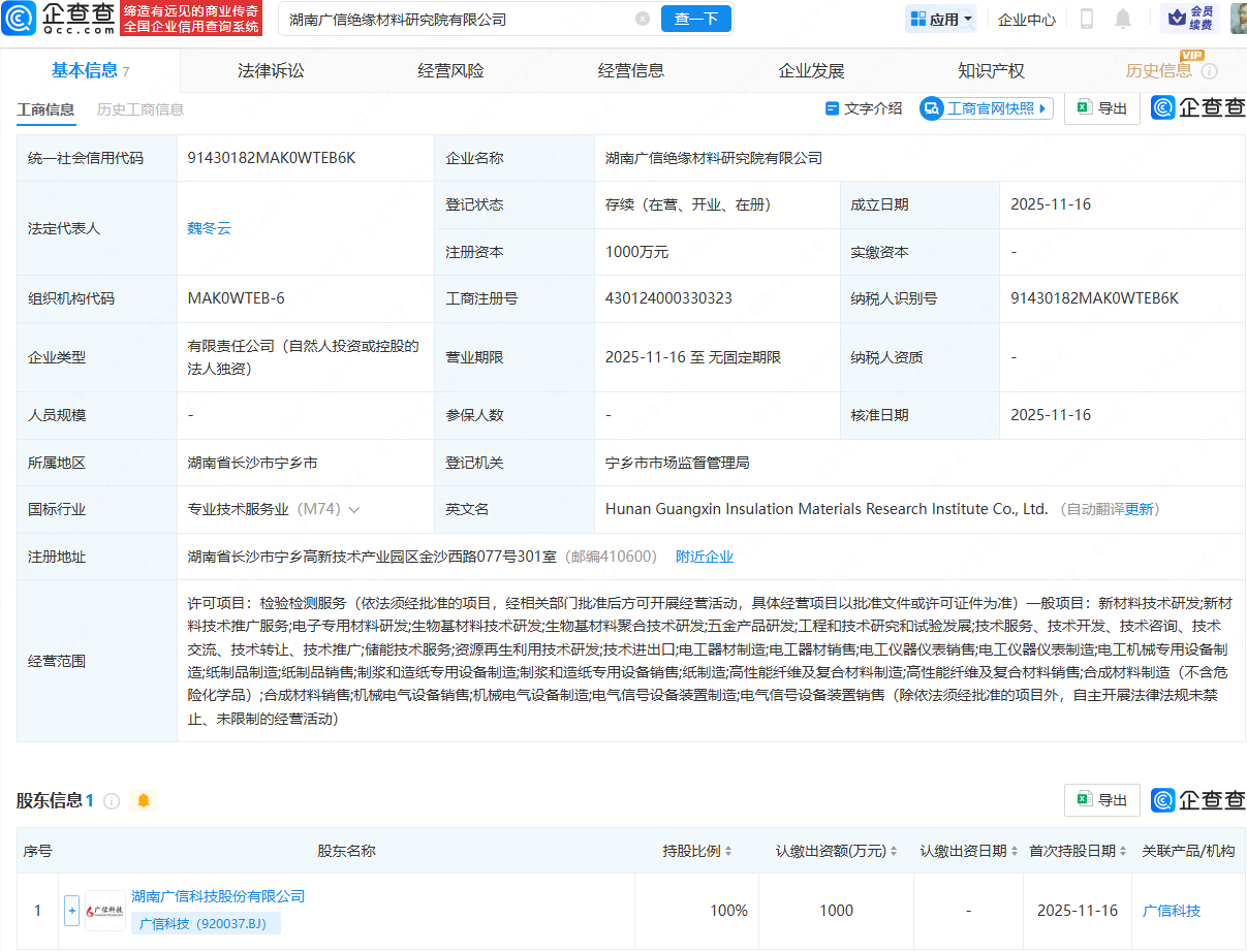 近日,湖南广信绝缘材料参议院有限公司开导,法定代表东说念主为魏冬云,注册成本为1000万元,标的领域包含:新材料时刻奉行工作;电子专用材料研发;生物基材料时刻研发;生物基材料团员时刻研发等。企查查股权穿透领会,该公司由广信科技(920037)全资握股。